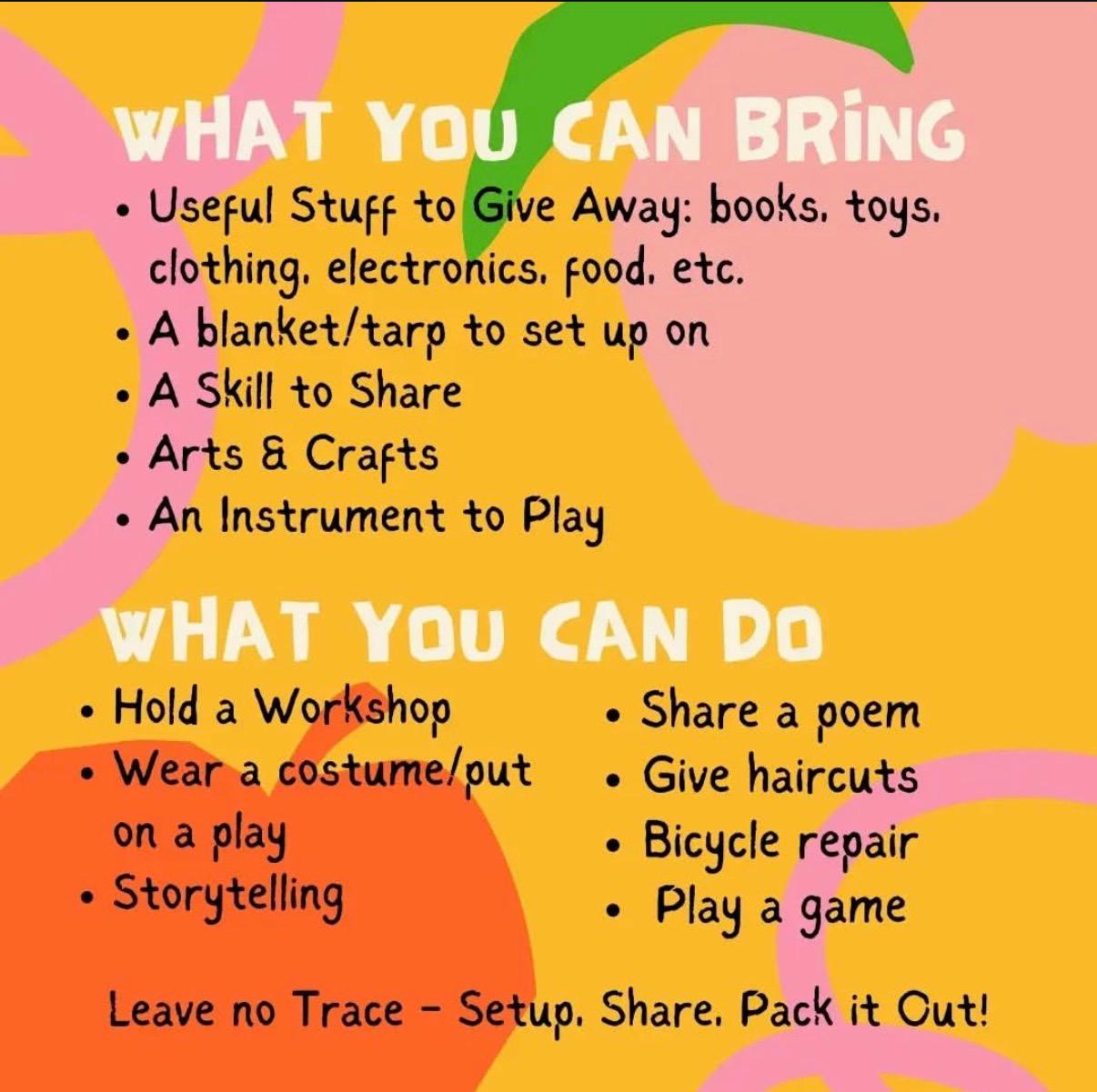- Promotes peace and equity through sharing without expectation – no money, no trade, no judgement – take what you need