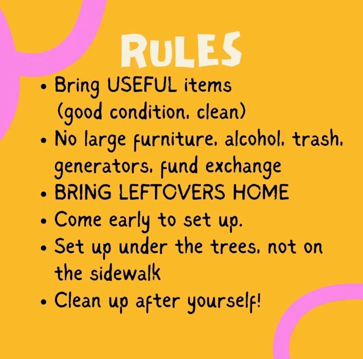 - Take home any items you brought that weren’t taken by someone else (we leave no trace here!).